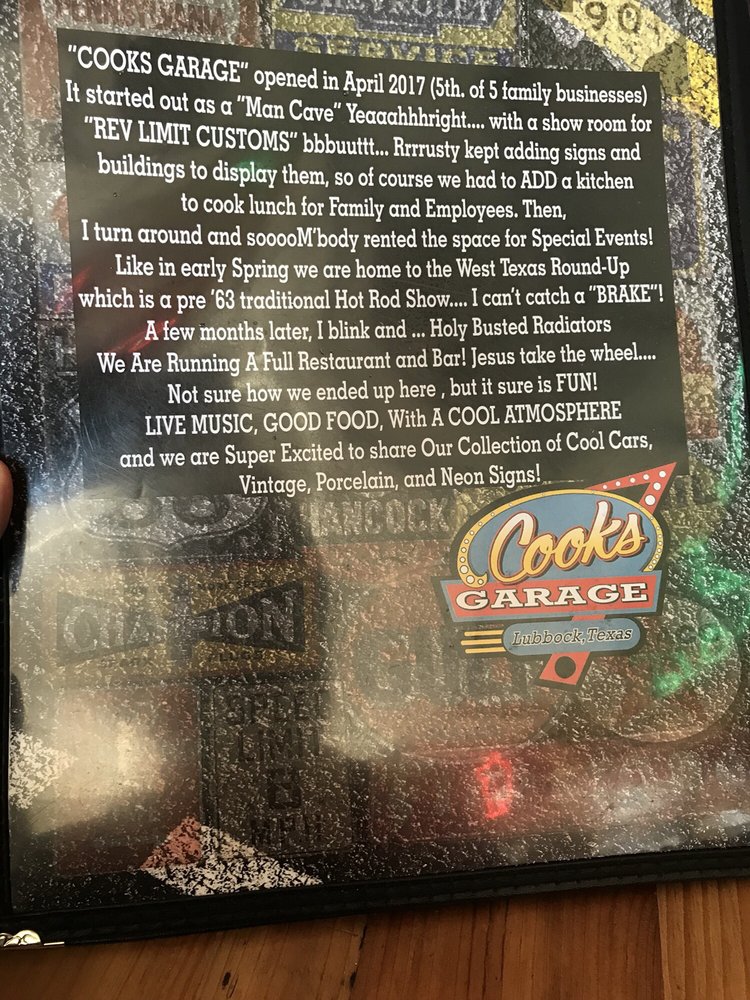 Cook's Garage makes dining convenient with services like takeout, delivery, and reservations, along with a full bar to enhance your experience. Plus, the friendly waiter service adds a personal touch that keeps patrons coming back. If you're in Lubbock, don’t miss the chance to savor their unique offerings!